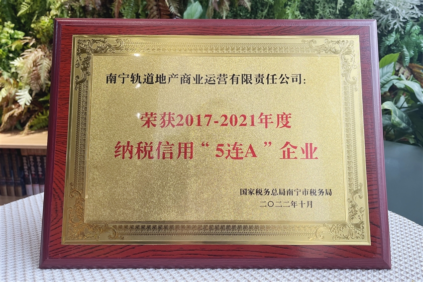 近日,軌道地產商業(yè)公司榮獲國家稅務總局南寧市稅務局授予的納稅信用“5連A”企業(yè)榮譽稱號。獲此殊榮,不僅是稅務機關對軌道地產商業(yè)公司稅務管理工作的充分肯定,更為軌道地產商業(yè)公司走高質量發(fā)展之路提供了強有力的支撐。