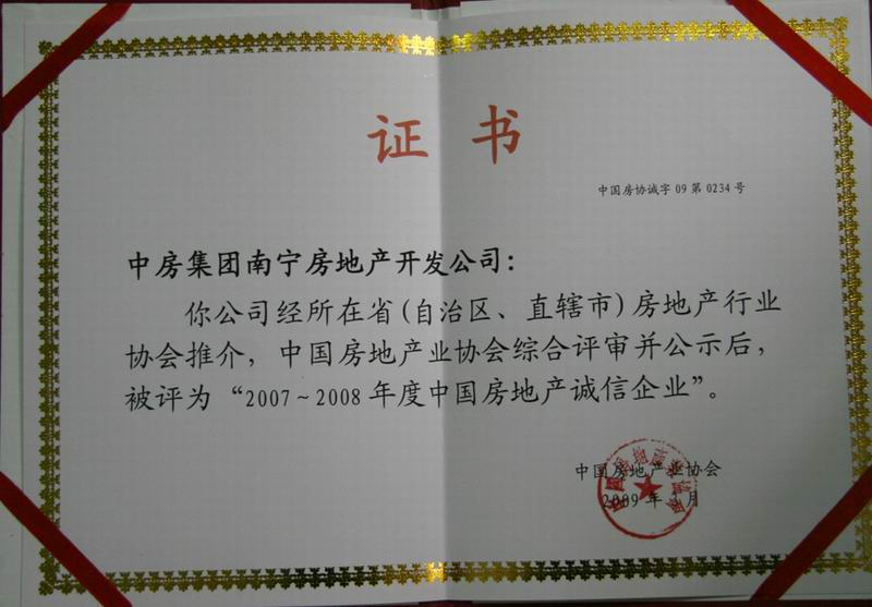 熱烈祝賀中房集團(tuán)南寧房地產(chǎn)開發(fā)公司榮獲2007-2008年度中國房地產(chǎn)誠信企業(yè)